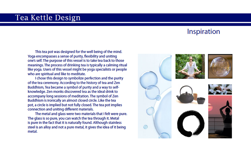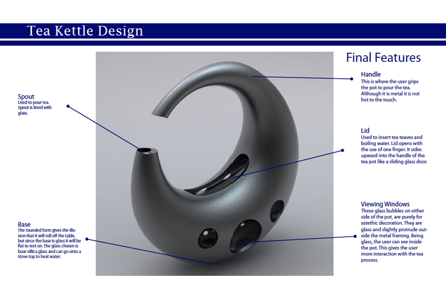 This project was designed for a tea kettle competition called "Tea-off" sponosored by "World Kitchen." Learning about the various molding processes of how products are formed, I discovered how to design and go about manufacturing a metal and glass teapot. Although this tea kettle was not actually physically created, it mimics a realistic product. Rendering created in Alias.